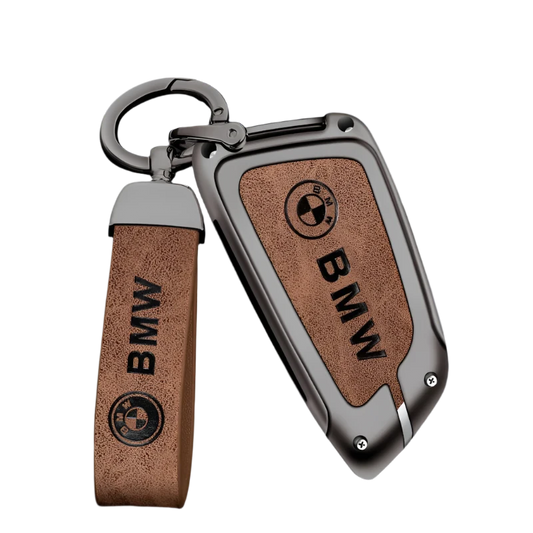 Metal Leather Car Key Case Cover Shell with Leather Keychain for BMW 1-7 Series & X Series (F20, G20, G30, G05, G11, F15, F16, G01, G02, F48, etc)